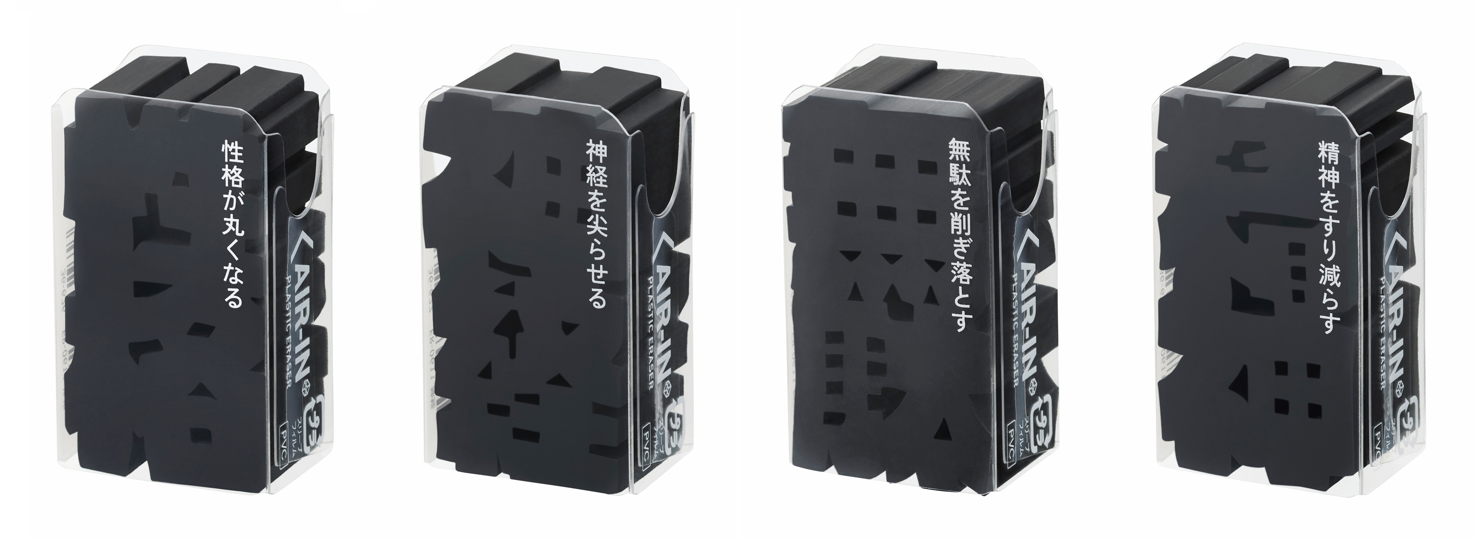 また、「性格」「神経」「無駄」「精神」の文字の凹凸や角の不規則な形状により、使うたびに消し心地や当たり方が変化。密度が高く、崩れにくいデフォルメ文字は、削れ方によって印象が変わり、消し進める過程そのものを楽しめる。