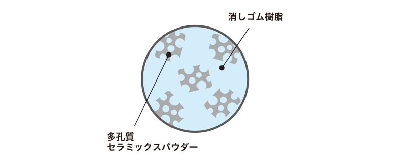 さらに、素材には、1989年に発売を開始したロングセラー消しゴム「エアイン」と同じ消しゴム樹脂を採用。多孔質セラミックスパウダーが無数のカドを生み出し、“いつもカドで消すような軽く快適な消し心地”を実現している。