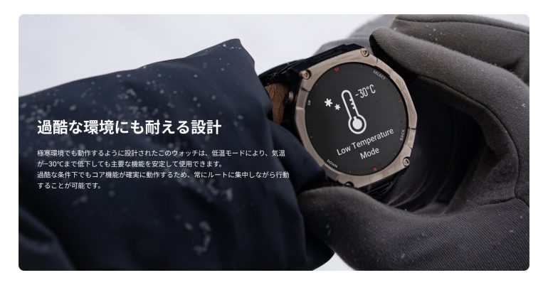 -30℃の極寒環境下でも正常に動作する低温モードを搭載し、冬山登山や極地探検でも安心して使用できる。また、10ATM防水(水深100m相当)に対応し、最大深度45メートルまでのレジャースキューバダイビングモードも搭載。さらに、軍事規格(MIL-STD-810H-2019)認証を取得し、耐衝撃性・耐熱性・耐寒性を兼ね備えている。