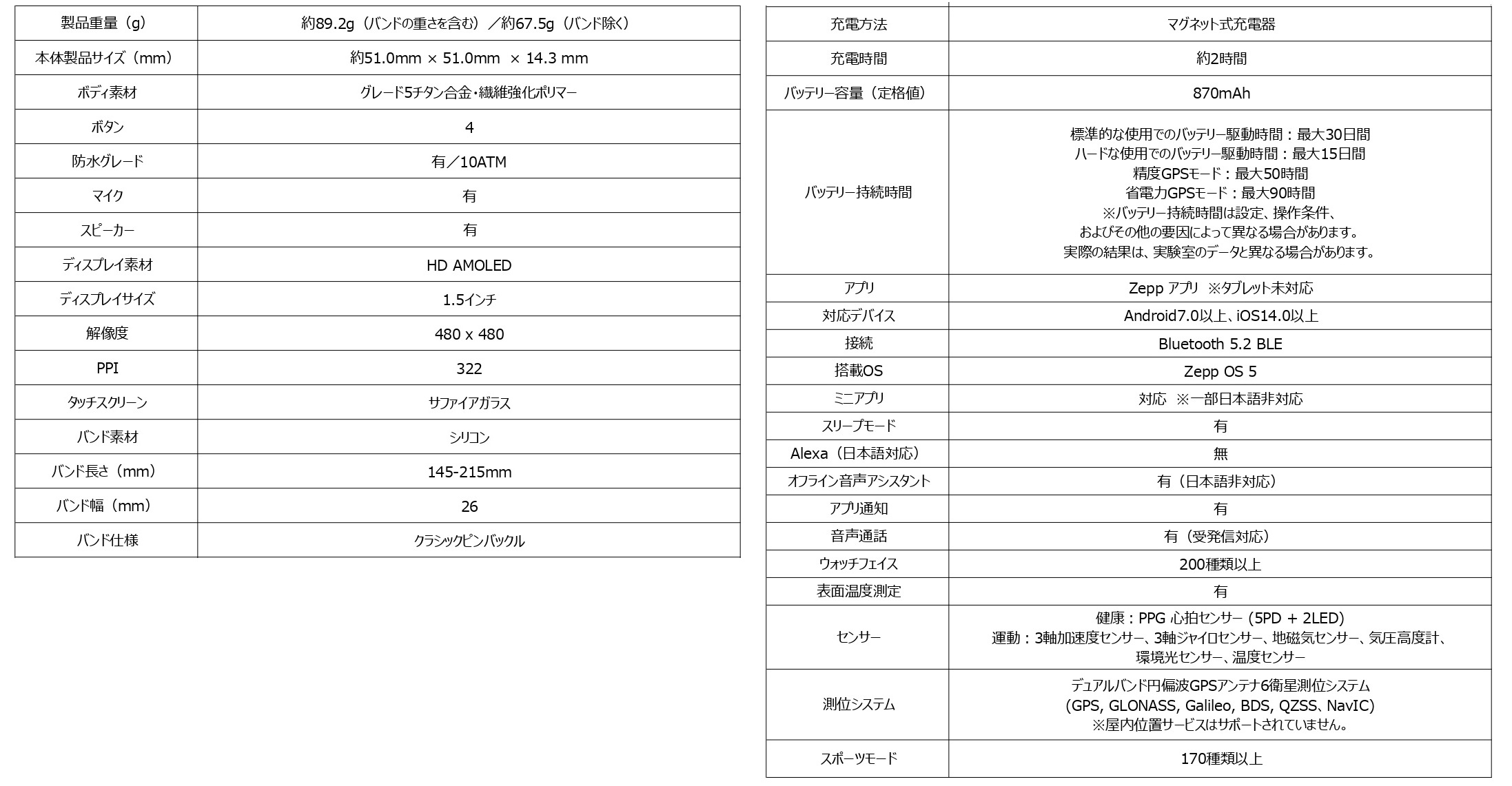本製品は、「予測不能な自然に挑む最強ギア」をコンセプトにしたスマートウォッチ。直径51mmの超大画面AMOLEDディスプレイ(最大輝度3,000nit)、最大級の64GBストレージを搭載し、世界中のベースMAPもプリインストール。また、最大30日間持続するバッテリーや、最上級グレード5のチタン合金製ベゼル&ケースバックも採用する。