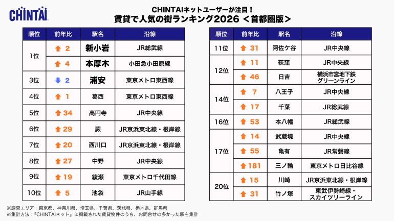 CHINTAIはこのほど、賃貸物件検索サイト『CHINTAI ネット』に掲載された首都圏の賃貸物件のうち、お問合せの多かった駅を集計しランキング化した「CHINTAI ネットユーザーが注目!賃貸で人気の街ランキング 2026」首都圏版を発表した。