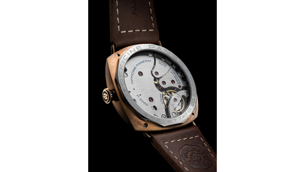 3日間のパワーリザーブを備えた大型ムーブメント、P.3000キャリバーを内蔵したケースのブロンズ素材は、純粋な銅と純粋な錫を使用することで、表面に独特の緑青が形成される特別な組成を誇っている。