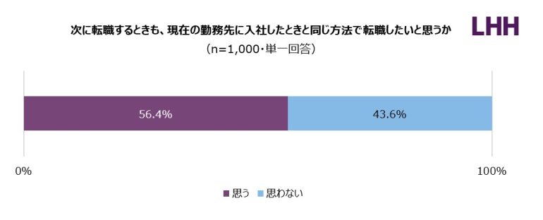 続いて、「あなたは、次に転職するときも、現在の勤務先に入社したときと同じ方法で転職したいと思いますか?」と質問したところ、56.4%が、「思う(次に転職するときも、現在の勤務先に入社したときと同じ方法で転職したい)」と回答した。