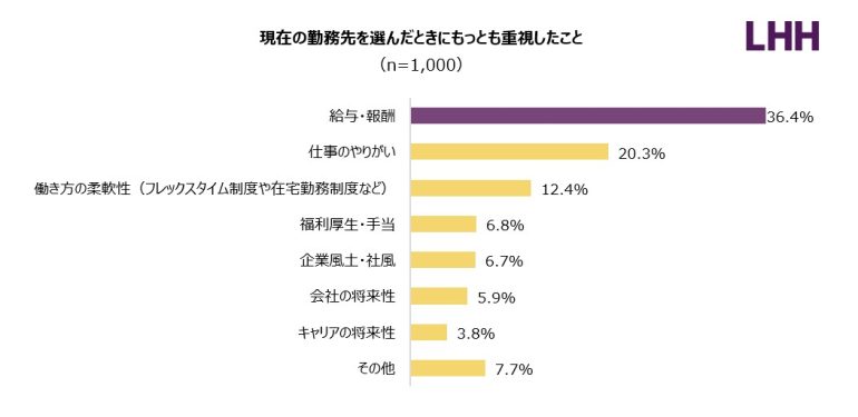 転職により現在の勤務先に入社した全国の会社員1,000人に対し、「現在の勤務先を選んだとき、もっとも重視したことはなんですか?」と質問したところ、重視していたことの1位は「給与・報酬」(36.4%)となった。2位は「仕事のやりがい」(20.3%)、3位は「働き方の柔軟性」(12.4%)となった。
