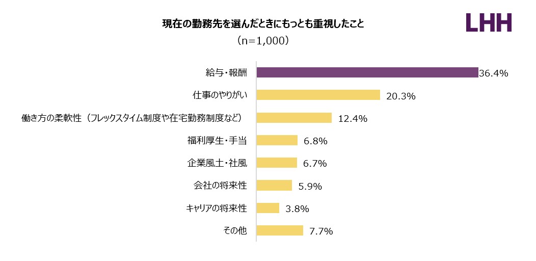 転職により現在の勤務先に入社した全国の会社員1,000人に対し、「現在の勤務先を選んだとき、もっとも重視したことはなんですか?」と質問したところ、重視していたことの1位は「給与・報酬」(36.4%)となった。2位は「仕事のやりがい」(20.3%)、3位は「働き方の柔軟性」(12.4%)となった。