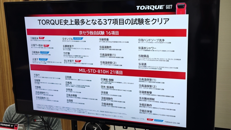 TORQUEの代名詞とも言える耐久性は、前モデル(G06)の29項目から一気に8項目増え、全37項目の耐久試験をクリアした。