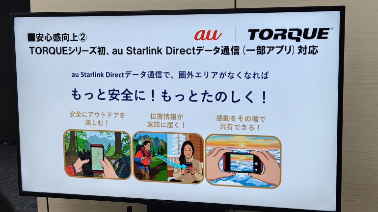 アウトドア用途で特に心強いのが、衛星通信との連携である。前モデルではメッセージサービスのみだった「au Starlink Direct」のデータ通信に、シリーズとして初めて対応した。