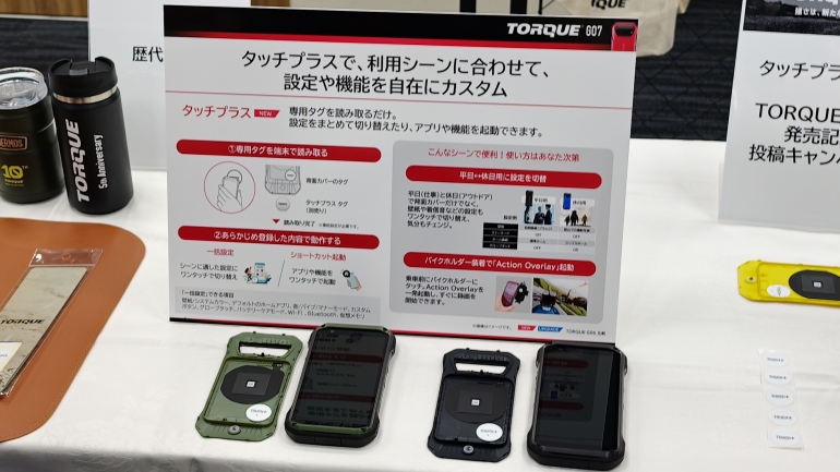 また、背面のバッテリーカバー裏にはNFCタグを用いた新機能「タッチプラス」が仕込まれている。本体背面をタグにタッチするだけで、壁紙や特定アプリの起動、端末の設定(平日用/休日用、バイク走行用モードなど)を一括で瞬時に切り替えることが可能となる。