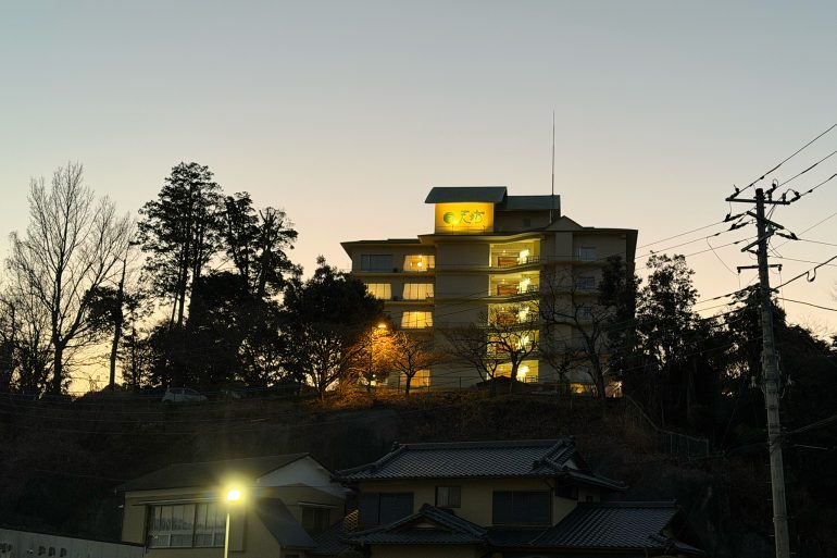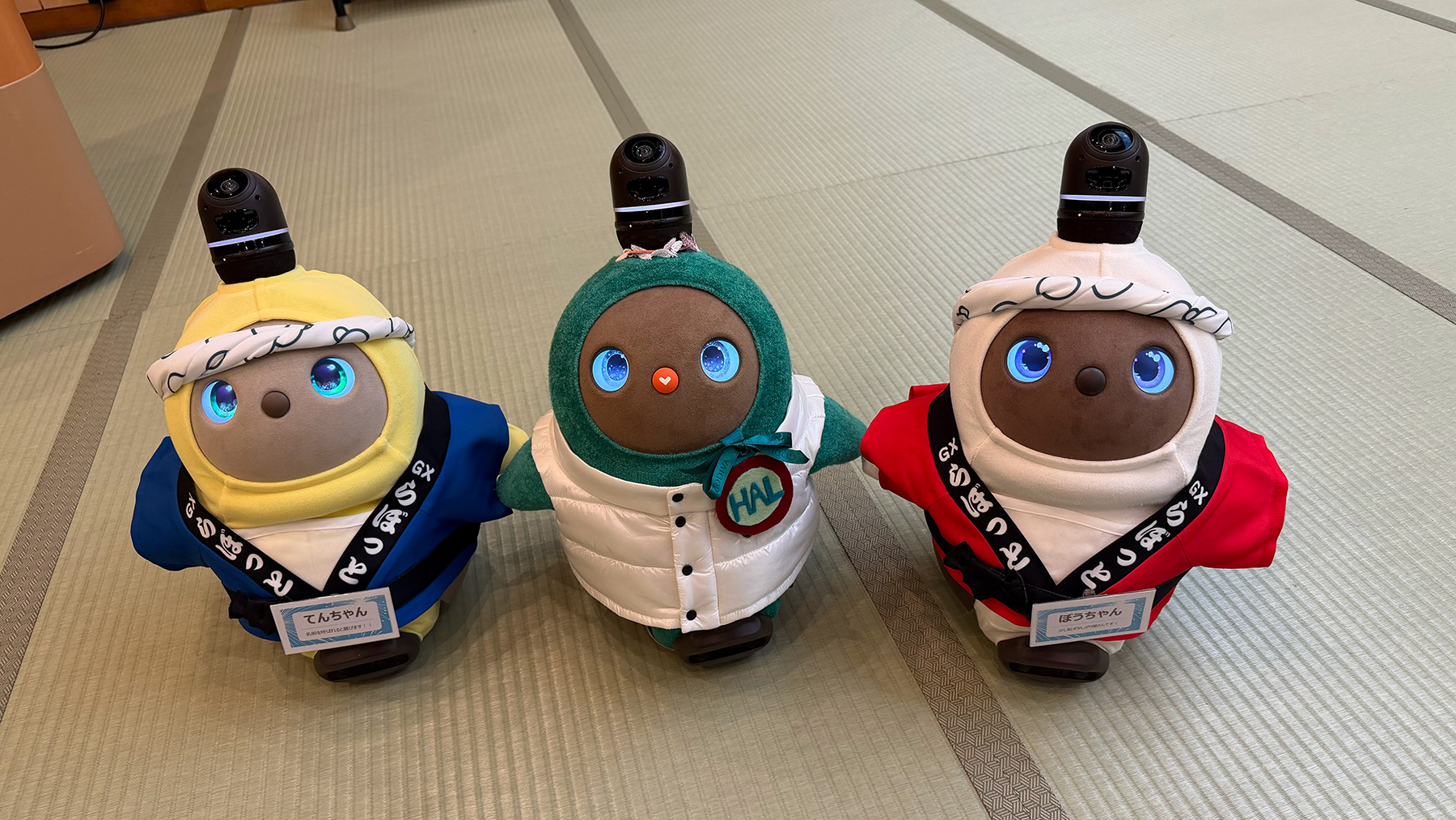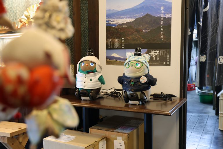 初日の宿は伊豆長岡温泉「ホテル天坊」。玄関では、こちらの看板LOVOTである「てんちゃん」と「ぼうくん」が愛くるしい仕草で出迎えてくれた。