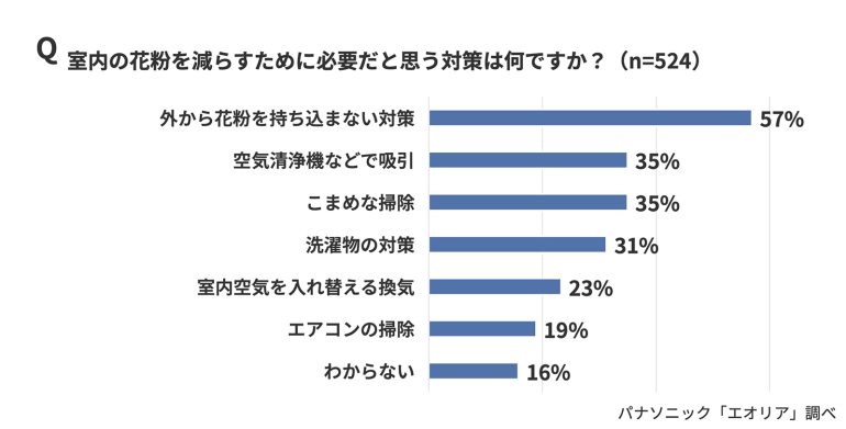 花粉がどこから室内に入り込むのかについての理解度では、誤解があることも浮き彫りになった。「室内に侵入する花粉の主な経路はどこからだと思いますか?」という質問では、「衣類・髪に付着した花粉」(64%)、「窓の開閉」(54%)、「洗濯物」(37%)、「玄関の開閉」(36%)といった項目が多く挙がったが、13%が「エアコン」を侵入経路として挙げた。だが換気機能を搭載していない一般的なエアコンは、室内の空気を吸い込んで暖めたり冷やしたりして再び室内に吹き出している。室内の空気を循環させているだけなので、通常はエアコンから花粉が侵入することはないという。侵入経路がわからないと回答した人も13%もおり、多くの人が花粉の侵入経路を正しく理解していないようだ。室内の花粉を減らすための対策では、「外から花粉を持ち込まない対策」(57%)がもっとも多く、「空気清浄機などで吸引」(35%)、「こまめな掃除」(35%)、「洗濯物の対策」(31%)などが続いた。“持ち込まない・ためない・取り除く”という複数の対策を組み合わせる必要があると考えている人が多かった。