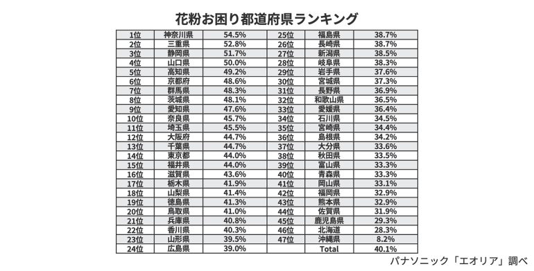 パナソニックは、もっとも花粉に困っている人が多い『花粉お困り都道府県ランキング』を作成し、「花粉に関するお困りごと調査」を実施。その結果とパナソニック エアーマイスターの福田風子氏が解説する室内の花粉を減らすためにできる具体的な対策を合わせて紹介していこう。
