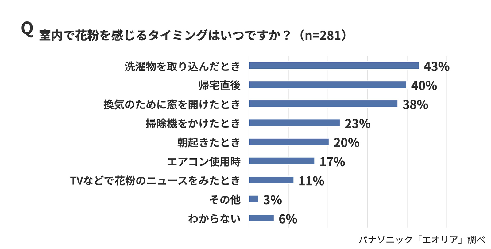 どのようなタイミングで室内の花粉を感じるかについては、もっとも多かったのは「洗濯物を取り込んだとき」(43%)で、それに「帰宅直後」(40%)、「換気のために窓を開けたとき」(38%)が続いた。衣類や洗濯物、換気などを通じて日常動作の中で花粉が室内に持ち込まれているようだ。