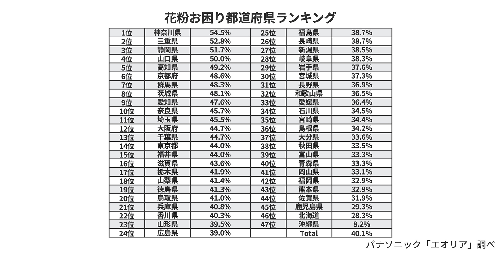 全国の20代から60代の男女5463名に花粉に困っているか質問すると、「とても困っている」と「やや困っている」の合計割合の都道府県別1位は神奈川県(54.5%)になった。2位は三重県(52.8%)、3位は静岡県(51.7%)、4位は山口県(50.0%)、5位は高知県(49.2%)というランキングになった。4位以上の県は、いずれもお困り率が半数を超えており、県民のふたりにひとりが花粉に困っていることがわかった。下位は、46位が北海道(28.3%)、47位が沖縄県(8.2%)と避粉地として知られる地域になった。