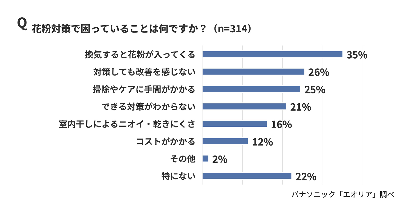 実際に行っている室内の花粉対策では、「空気清浄機の使用」(27%)、「部屋干し/乾燥機使用」(23%)、「マスク着用」(20%)などが上位だった。「何もしていない」と答えた人が約4割も存在しており、対策の必要性を感じつつも行動に移せていない人も多いようだ。花粉対策で困っていることでは、「換気すると花粉が入ってくる」(35%)が最多の回答だった。それに「対策しても改善を感じない」(26%)、「掃除やケアに手間がかかる」(25%)、「できる対策がわからない」(21%)と続いたが、「対策したいがどうすればいいのかわからない」や「やっても効果を実感しにくい」というジレンマも回答からは見えてきた。