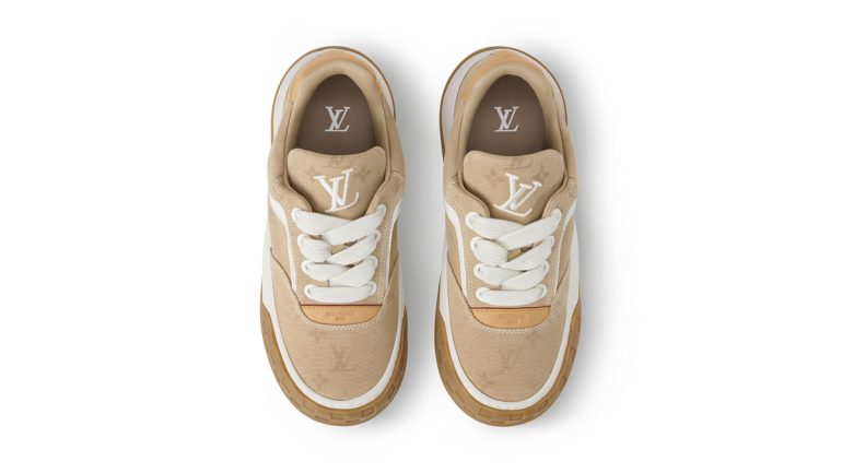 デニムにさりげなくモノグラム・パターンをあしらった「LV ティルテッド スニーカー」。メゾンを象徴するヌメ革のトリミングが、2000年代初頭のスニーカーから着想を得たデザインを引き立てる。