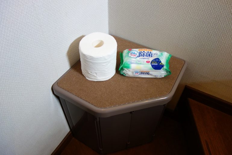 「IMP309 ポータブルトイレ」は折りたたんだままパッケージで保管しているが、「ポータブルコーナートイレ」のほうは廊下のコーナーに普段から据え置きし、いつでも使えるようにスタンバイ。中には付属の汚物袋10回分、凝固剤10回分のほか、BOSSの「非常用トイレ50回分4点セット」やアルコールジェル、ウェットティシュ、トイレットペーパーなどを入れてある。