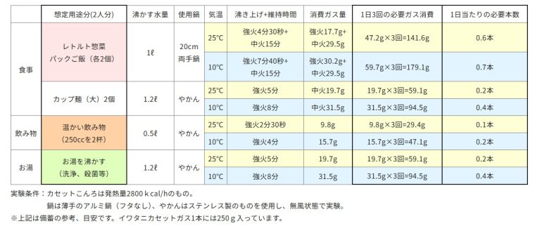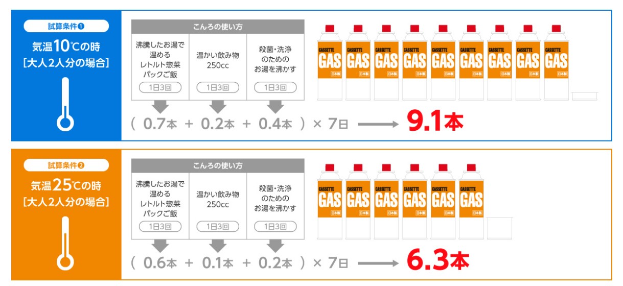 キッチンのガス台は2口、3口のものが一般的だから、カセットコンロは万一の故障も考慮し、一般的なものと防風機能を持ったタイプのふたつを用意しておくといいだろう。調理と湯沸かしを2台のカセットコンロで同時に行うこともできるからである。もちろん、ガスボンベのストックも不可欠だ。カセットコンロ、カセットボンベの大手メーカー、イワタニのデータによれば、1週間、大人2人分で気温10度の場合、カセットボンベ9.1本。同、気温25度の場合6.3本という試算がある。