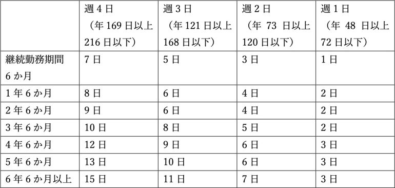 アルバイトに付与される有給休暇の日数は、継続勤務期間と所定労働日数に応じて決まります。所定労働日数は、週単位または年単位のうち、有給休暇の日数が多くなる方を用います。