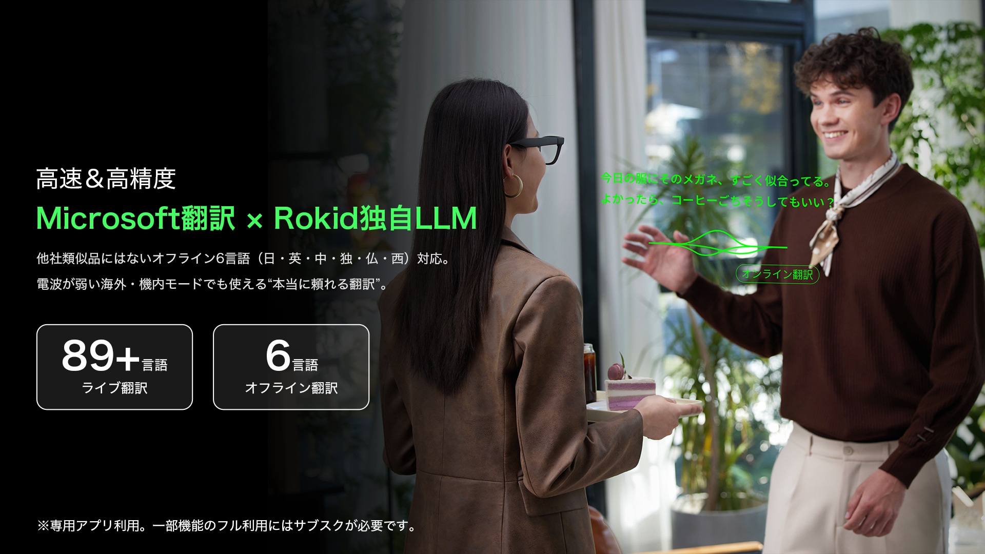 リアルタイム翻訳にも対応しており、海外旅行や国際会議で相手の言葉を聞くと、視界に日本語字幕がリアルタイムで表示されるほか、メニューや看板に視線を向けるだけで内容を読み解くことができる。しかも、リアルタイム翻訳は89以上の言語に対応し、主要6言語(日本語・英語・中国語・ドイツ語・フランス語・スペイン語)はオフラインでも利用可能なため、地下鉄など通信が不安定な環境や、SIMカードなしの状態でも翻訳可能。さらに、専用アプリと組み合わせれば、相手のスマホに翻訳結果を表示できる「双方向会話モード」で、現地の方とのコミュニケーションもスムーズに行なえる。