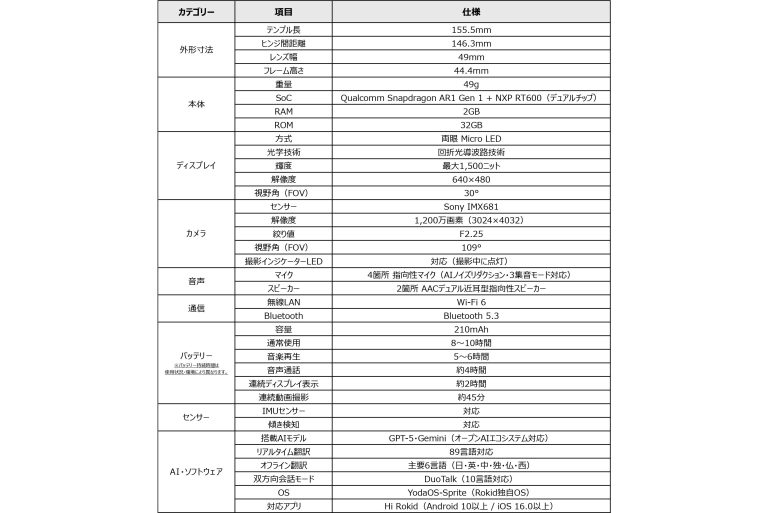 本製品は、中国発のグローバルテクノロジー企業Rokidが開発したスマートAIグラス。Micro LED Greenディスプレイと、GPT-5&Geminiをはじめとした複数のAIモデルを搭載し、見るだけ・話すだけで、翻訳や検索結果が“視界の中”に現れることが最大の特徴。また、カメラ、マイク、スピーカーを搭載しながら、わずか49gの超軽量設計を実現しているのも嬉しいポイントだ。