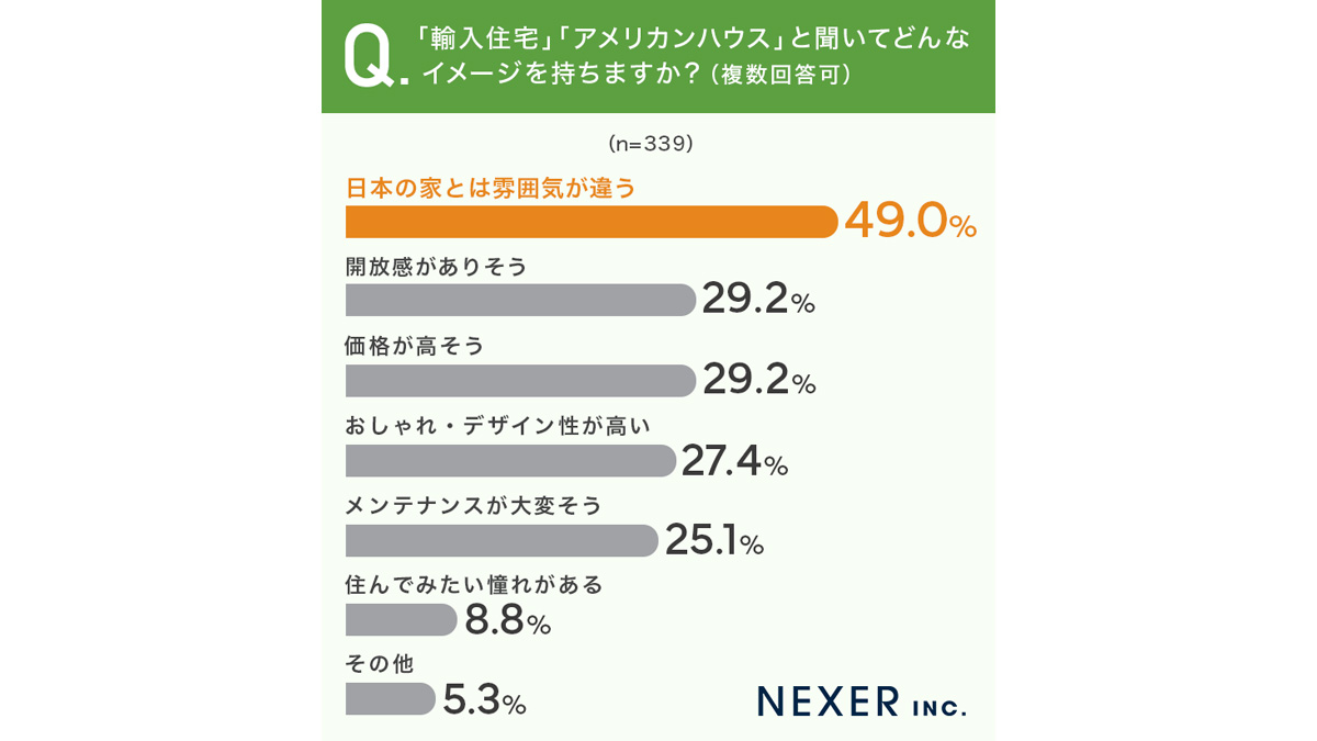 「輸入住宅」「アメリカンハウス」のイメージ、最多は「日本の家とは雰囲気が違う」で49.0%
