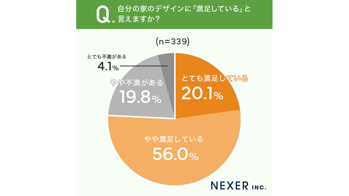最後に、自分の家のデザインに満足しているかどうかを聞いたところ、「とても満足している」が20.1%、「やや満足している」が56.0%で、合わせて76.1%の人がデザインに満足しているとわかった。