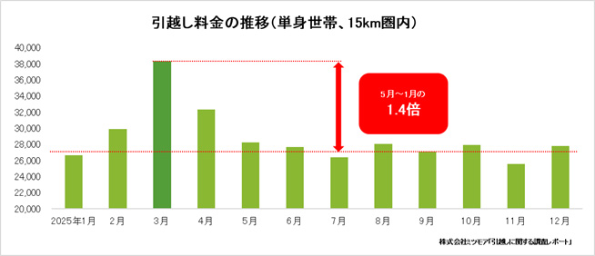 また、15km圏内の単身世帯の引越し状況を調査したところ、繁忙期の3月は繁忙期以外の5月~1月平均と比較して、約1.4倍の価格に跳ね上がるケースも。2026年は、物価高騰やドライバー不足が続く中、2024年問題の影響が中長期化しており、さらなる料金高騰が予測される。