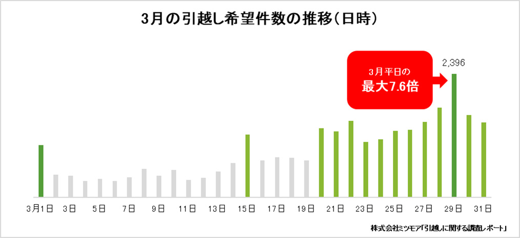 依頼件数に関しても「3月」が最も多く、繁忙期以外の5月~1月平均と比較して、4.6倍もの希望が集中した。さらに3月後半は依頼が集中し、3月29日(土)を希望する人は、3月1日(土)と比べ2.3倍、3月前半の平日と比べると5.7~7.6倍にも上っている。近年は国や業界団体から分散引越しの呼びかけが進む一方、進学や人事異動など時期をずらしにくい事情も多く、結果として3月に需要が集中する構造は大きく変わっていないことがわかる。