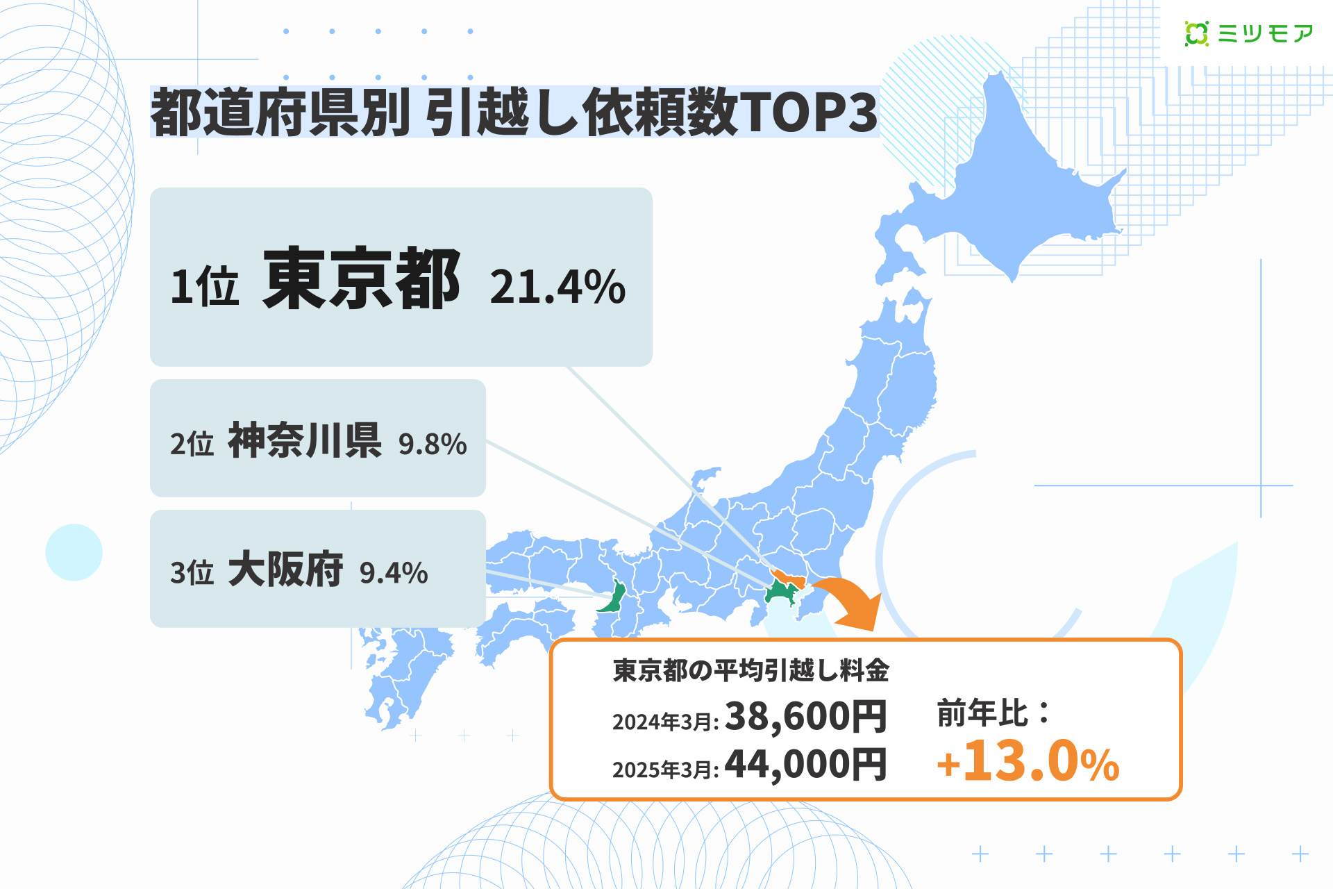 また、都道府県別でも料金高騰の動きが見られる。引越し依頼数の多い東京都に関しては、2024年3月(38,600円)と2025年3月(44,000円)を比較したところ、前年比+13.0%という結果になった。
