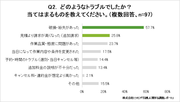 続いて、過去の引越しに関するトラブル経験について聞いた。結果、全体の31.0%が「トラブル経験がある」と回答し、全体の約3割を占める結果となった。トラブル内容として最も多いのは「破損・紛失があった(57.7%)」、次いで「見積より請求が高くなった(25.8%)」という結果に。また、アンケートでは多くのトラブル経験が寄せられ、裁判にまでつながったケースもあることが明らかとなった。