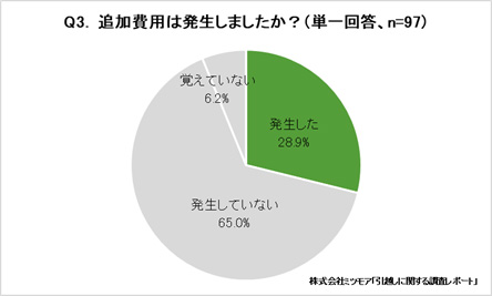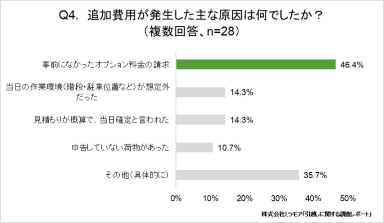 また、追加費用が発生したかどうかについて聞いた。発生したケースは28.9%、追加費用が発生した人の約半数(46.4%)が「事前に聞いていないオプション料金」を請求されたことが明らかになった。特に繁忙期は業者側も多忙で説明が不十分になりやすく、「養生費」「階段作業料」「待機料」などのオプション料金が当日になって請求されるケースが多くなると予測される。