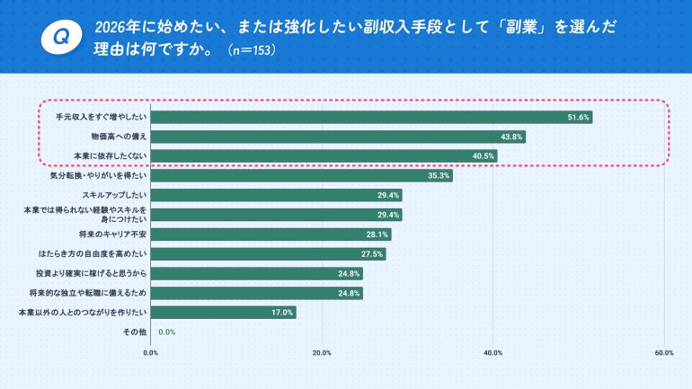2026年に始めたい、または強化したい副収入手段として「副業」を選んだ回答者にその理由について尋ねたところ、「手元収入をすぐ増やしたい(51.6%)」が最多となり、以下「物価高への備え(43.8%)」、「本業に依存したくない(40.5%)」が続いた。物価高への即時的な対応や、収入源の分散といった“生活防衛”を目的とした動機が強く表れていることがわかる。