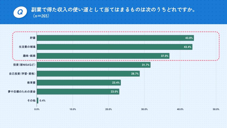 一方で、副業経験者に実際に副業で得た収入の使い道を尋ねたところ、「貯蓄(43.8%)」、「生活費の補填(43.4%)」、「趣味・娯楽(37.0%)」が上位となった。