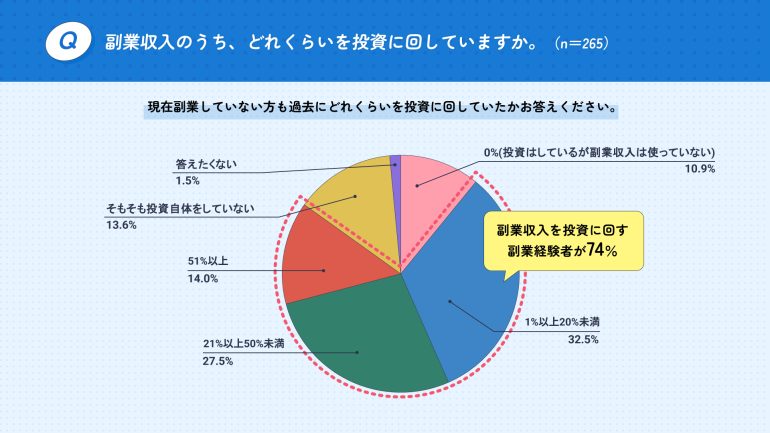 また、副業収入のうちどれくらいを投資に回しているかを尋ねたところ、74%が「投資に回している」と回答しており、日々の生活を支える実用的な使い道にとどまらず、将来に向けた資産形成への意識の高さがうかがえる。