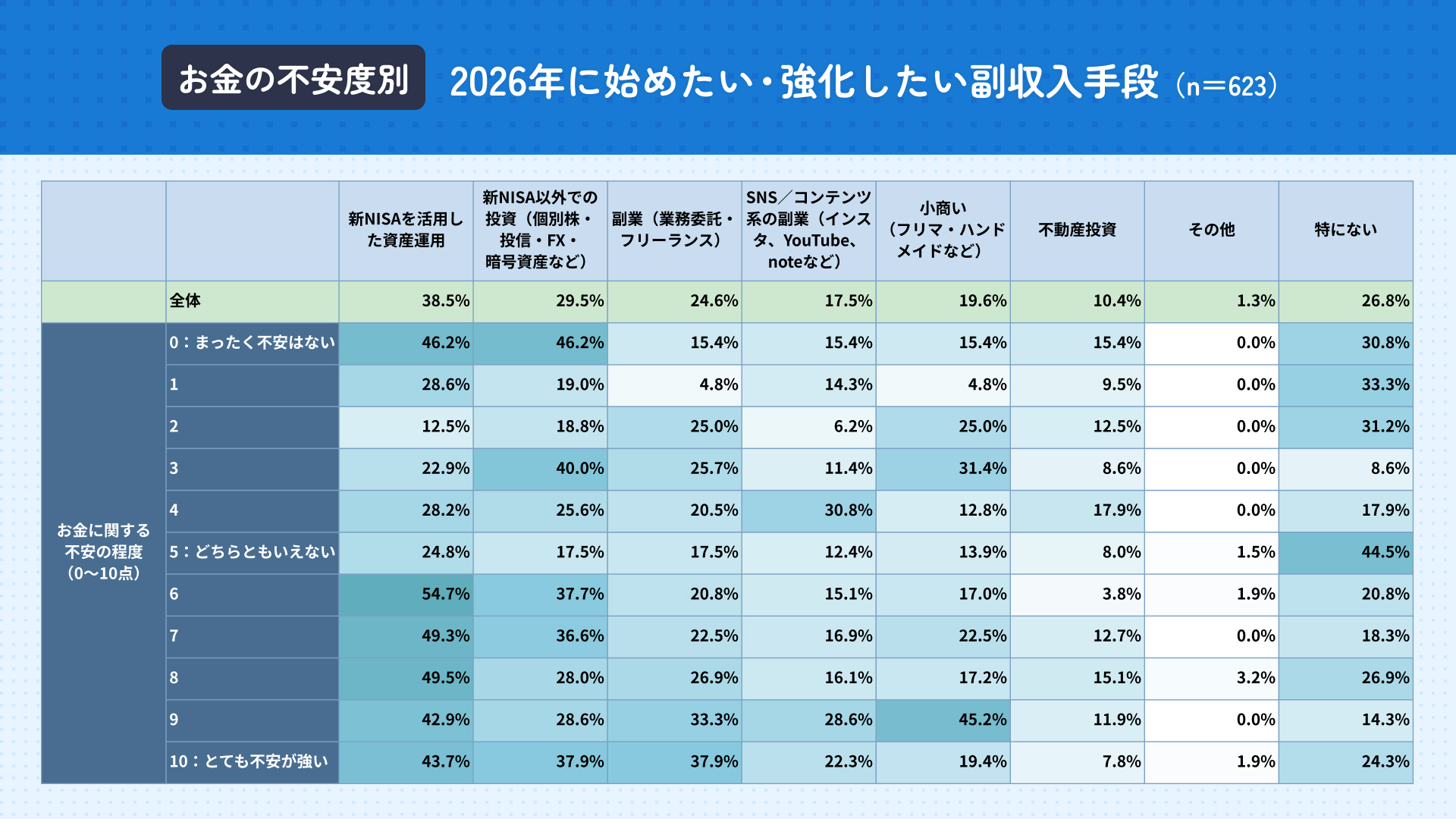 さらに、お金に対する不安度のスコアが高い人ほど、2026年に始めたい副収入手段として「副業」を選択している割合も高くなる傾向にあり、不安度に比例して副業意欲が増加する傾向が確認された。