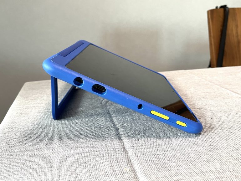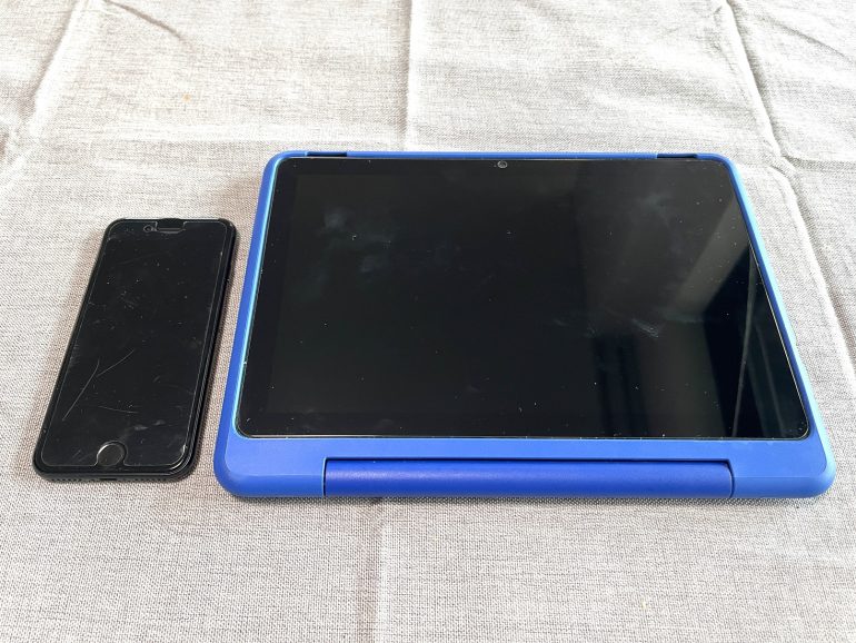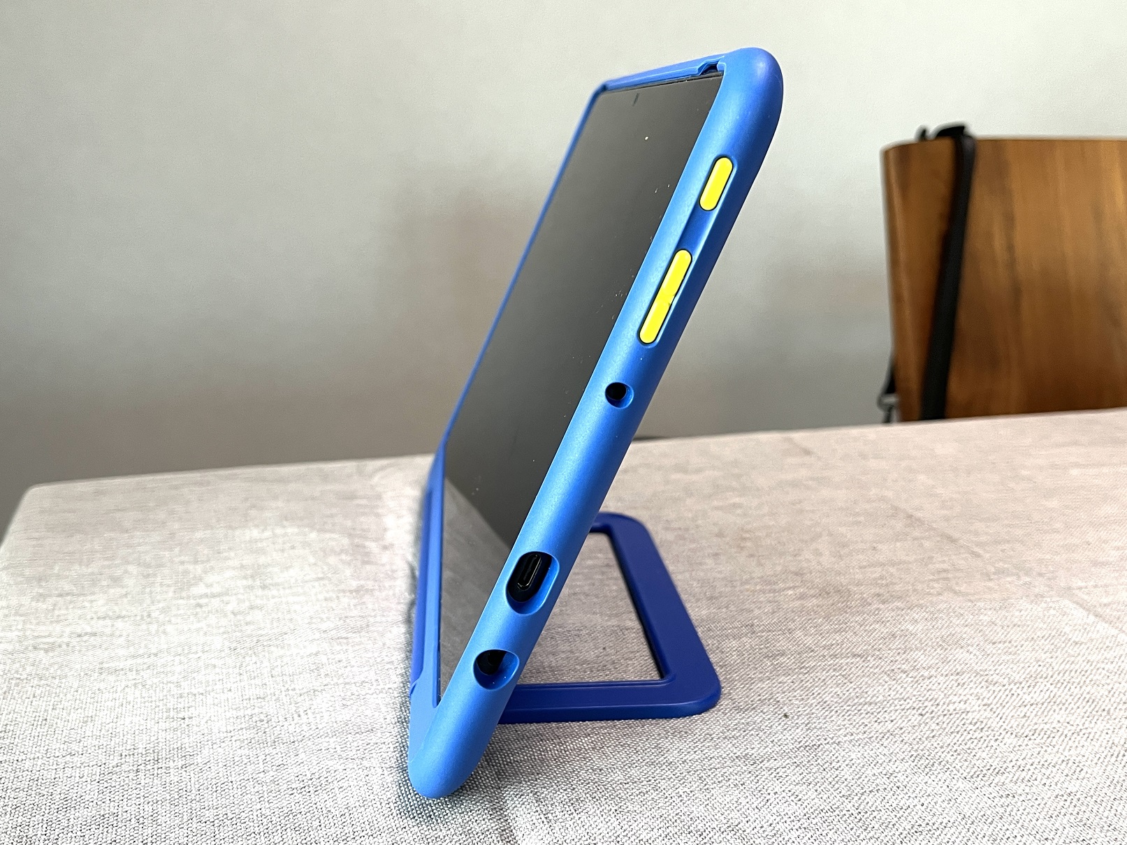 子どもが使う以上、落下などの不意のアクシデントは避けられないが、最初からカバーが付いていることで安心感は高い。価格にはその分のコストが含まれているものの、買い忘れの心配がない点では合理的だ。一方で、デザインの選択肢は限られているため、好みに合わない場合は別途カバーを探すか、最初から非キッズモデルを選ぶ必要がある。なお、画面の保護フィルムはセットに含まれていないが、必須アイテムと思われるので併せて購入すると良いだろう。