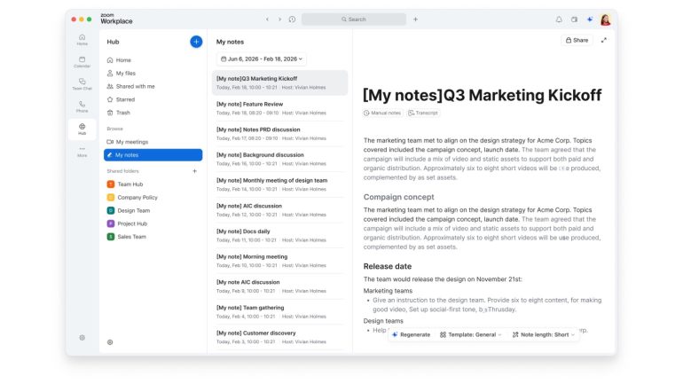 ユーザーはノートを作成できるほか、必要に応じてAI Companionにミーティングの文字起こしを基に内容を補完させることができる。対面でのミーティングやZoom Meetings に加え、Microsoft Teams や Google Meet など他のプラットフォームにも対応している。