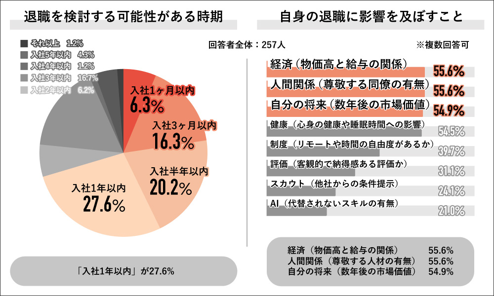 回答者全体の257⼈に退職を検討する可能性がある時期について聞くと、「入社1年以内」が27.6%で最多となり、以下「入社半年以内」が20.2%、「入社3ヶ月以内」が16.3%と続いた。また、自身の退職に影響を及ぼすことを聞くと、「経済(物価高と給与の関係)」「人間関係(尊敬する同僚の有無)」が同率で55.6%となり、次いで「自分の将来(数年後の市場価値)」が54.9%となった。