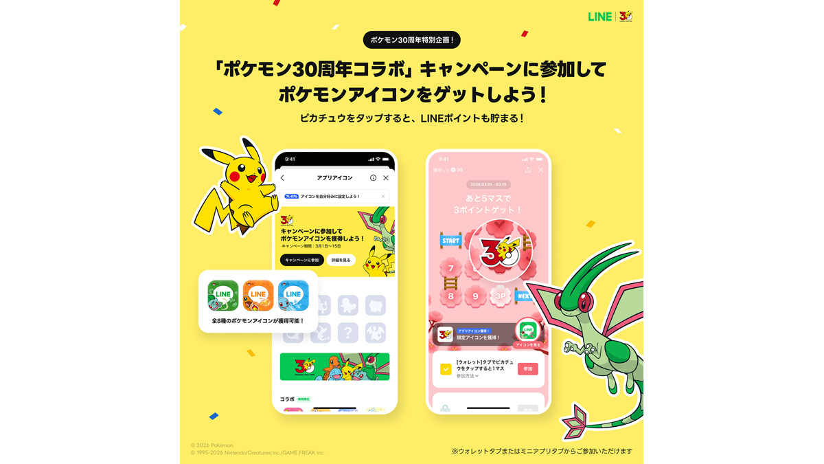 『LINE』アプリでは、ポケモン30周年を記念した特別なコラボレーションが2026年3月1日より実施中だ。コラボキャンペーン期間中は、『LINE』アプリのウォレットタブかミニアプリタブ内の「ポケモン30周年コラボ」キャンペーン上に出現するピカチュウをタップすると、クエストが進行して「LINEポイント」が貯まる。