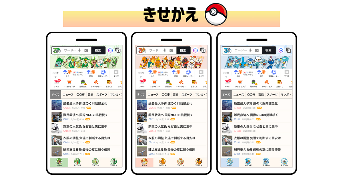 スマホの『Yahoo! JAPAN』アプリ、スマートフォンブラウザー版『Yahoo! JAPAN』トップページと『Yahoo!検索』の検索結果ページをポケモンに着せ替えできる特別デザインも登場する。くさ・ほのお・みずタイプをテーマにした3種類のきせかえデザインで、自分の好きなタイプにして毎日をポケモン気分で過ごせる。