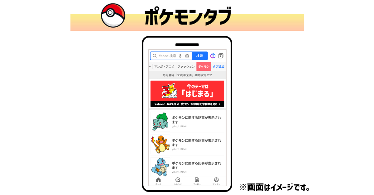 「ポケモン30周年」関連ニュースが一目でわかる「ポケモンタブ」と毎月『ポケモン』に関するトレンド情報を紹介する「ポケモントレンド」が『Yahoo! JAPAN』アプリに登場する。「ポケモンタブ」と「ポケモントレンド」では、これまでの『ポケットモンスター』シリーズのパッケージを飾るポケモンがデザインされたオリジナルスマホ壁紙もダウンロードできるようになる。なお壁紙は、毎月異なるデザインが公開される予定。