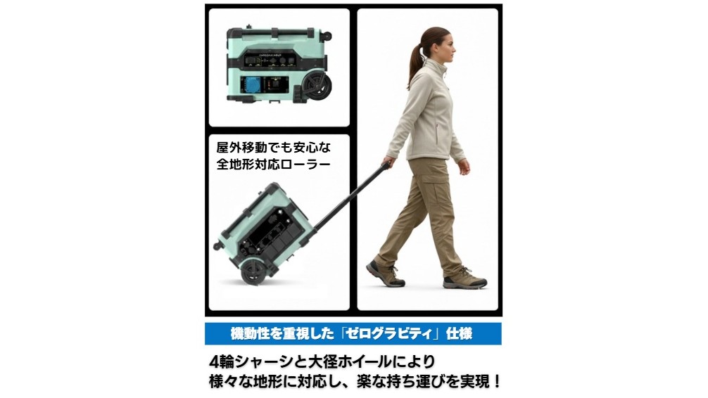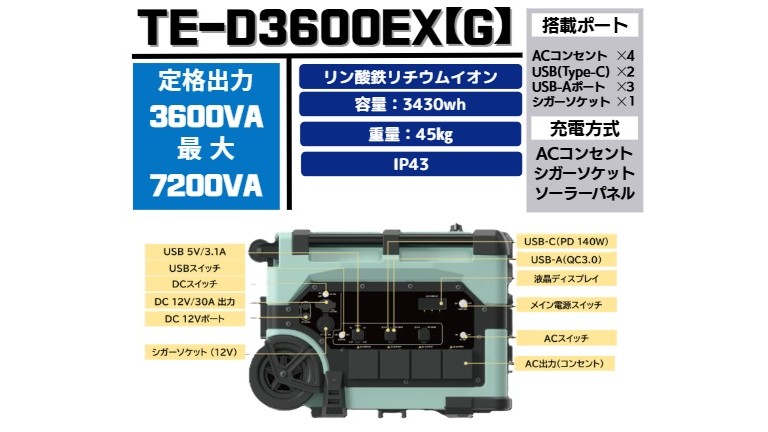 「TE-D3600EX」は、容量3,430Wh、定格出力3,600Wのポータブル蓄電池。置き型/可搬型どちらにも対応可能なハイブリッドモデルで、4軸シャーシと大径ホイールにより、楽な持ち運びを実現する。