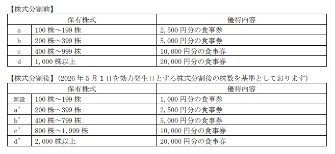 くら寿司は、2026年4月30日を基準日として1:2の株式分割を予定しているが、株式分割に伴って、分割後100株(分割前50株)の株主優待を新設する。