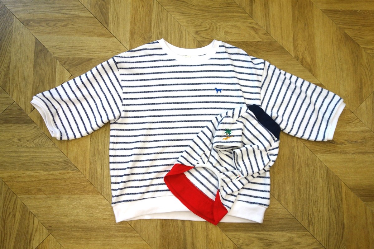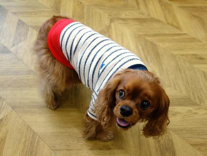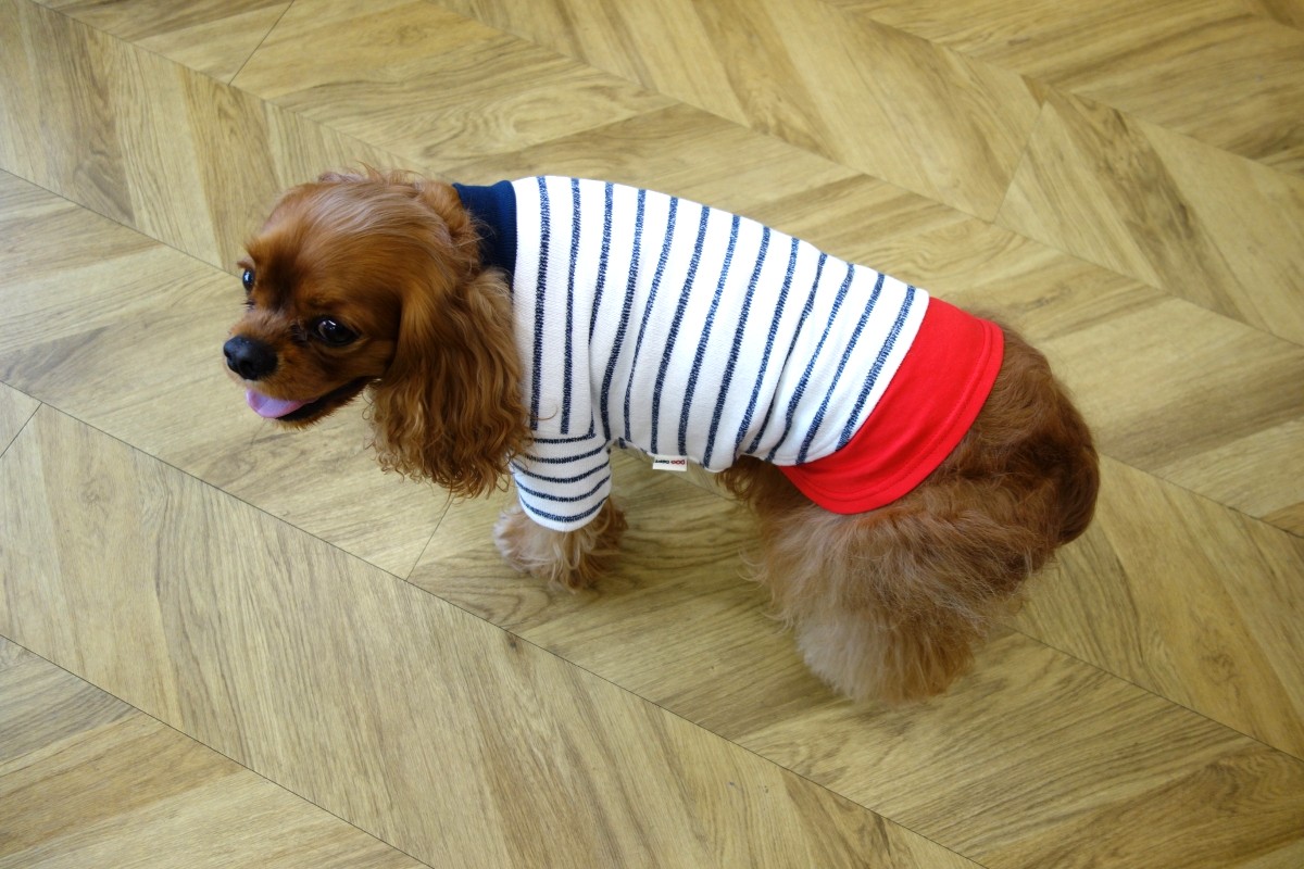そして、ドッグスタイリストのnanaeさんが、この春の@DIME、PETomorroの”わんこと行くクルマ旅”で、出演するキャバリアのアーモンドとともにぜひ着たいと選んだのが、ウーマンの「差し編みパイルボーダー5分袖」とドッグウエアの「差し編みパイルレイヤーT」のリンクコーデ。柔らかなパイル地で快適な着心地が心地よく、袖のパームツリーと裾のカラーがアクセントになっていて、予定しているロケ先の海に近いリゾート地の愛犬同伴専門のホテル、夕食のフレンチ料理にもぴったりな、フランス国旗のトリコロールカラー(自由・平等・友愛の意味)。ウーマンのほうは写真のホワイトとサックスの2色でサイズはフリー。