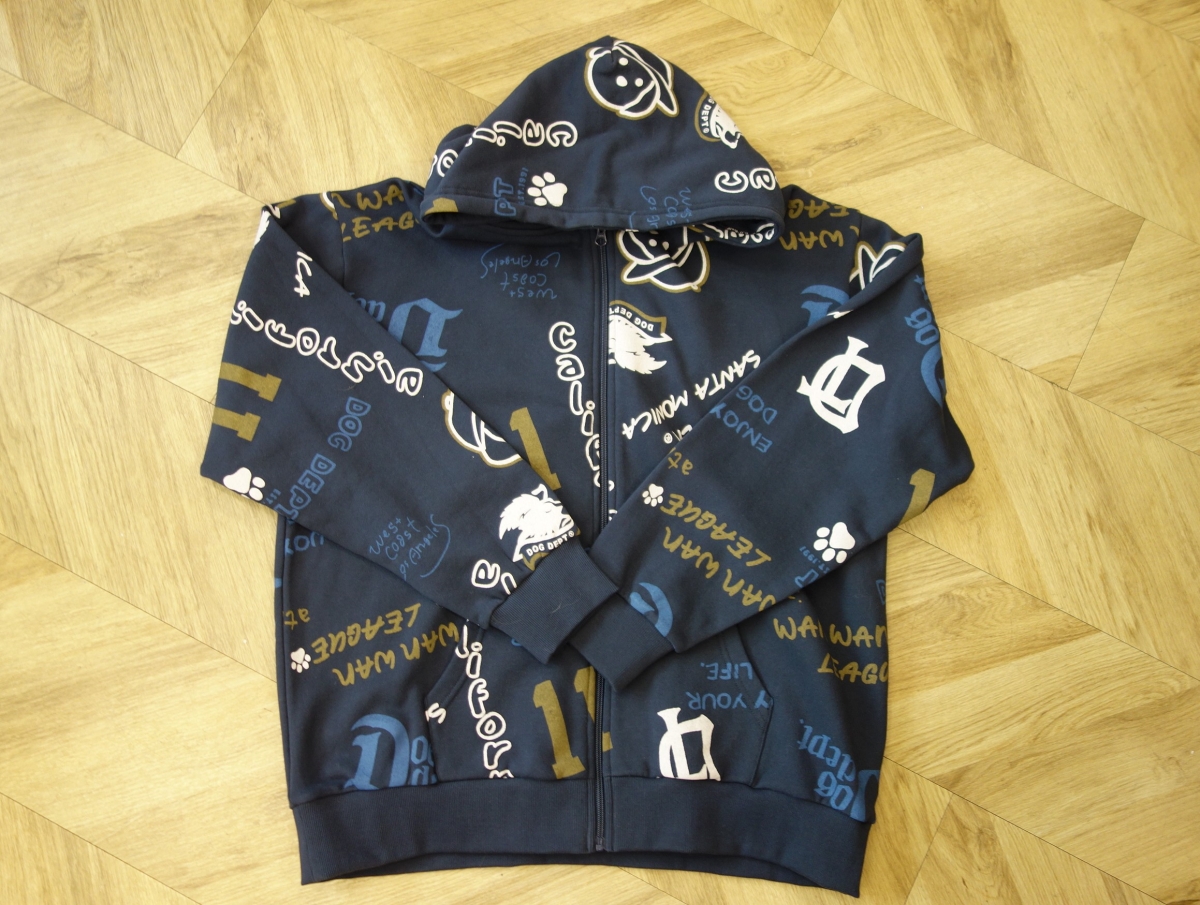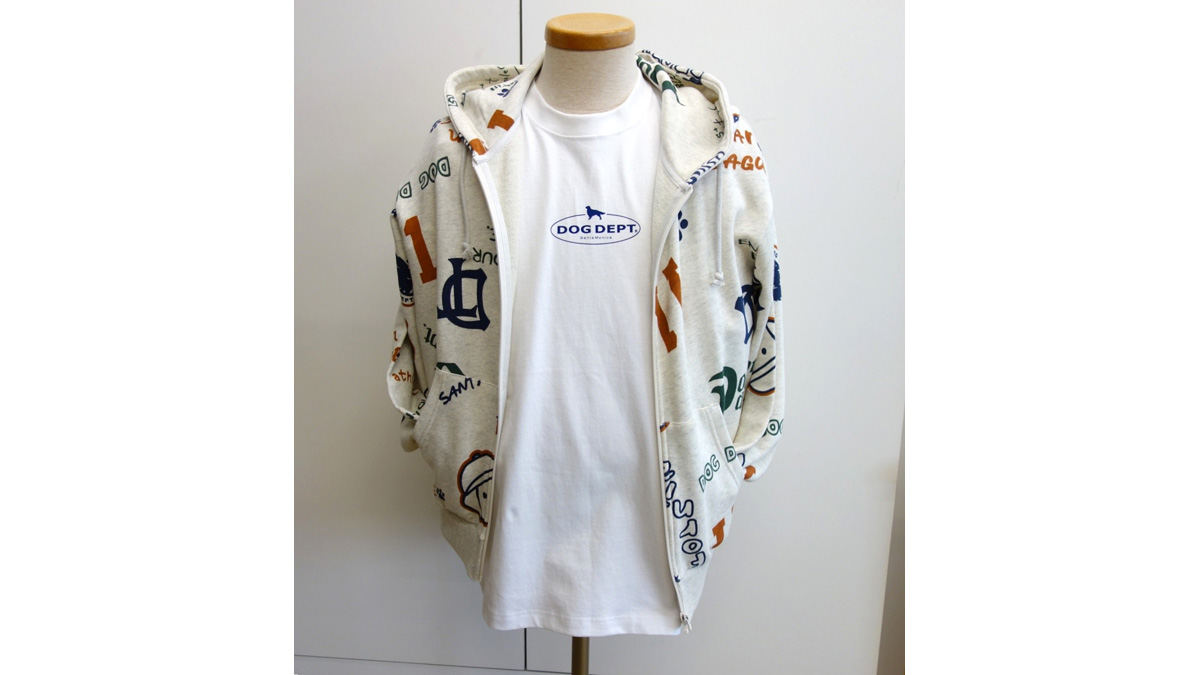 まずは、争奪戦間違いなしの新作、ユニセックスの「HELLO.MAX総柄ロゴジップパーカー」。DOG DEPTらしい遊び心を詰め込んだ総柄デザインのジップパーカーに注目です。春の肌寒い時期、夏でも朝夕のお出かけ、お散歩にぴったりの羽織りもので、流行の70年代ファッションを彷彿させる総柄がなつかしさと新しさを演出。愛犬との勝負服としても大活躍してくれそうです。カラーは写真のミックスグレーとネイビーの2色。サイズはS、M、Lが揃っています。中に合わせているのは、ユニセックスの「メインマークTシャツ」。こちらもホワイトとネイビーの2色で、サイズはM、L、XLの展開です。アウターが総柄なので、シンプルなTシャツがぴったりですね。