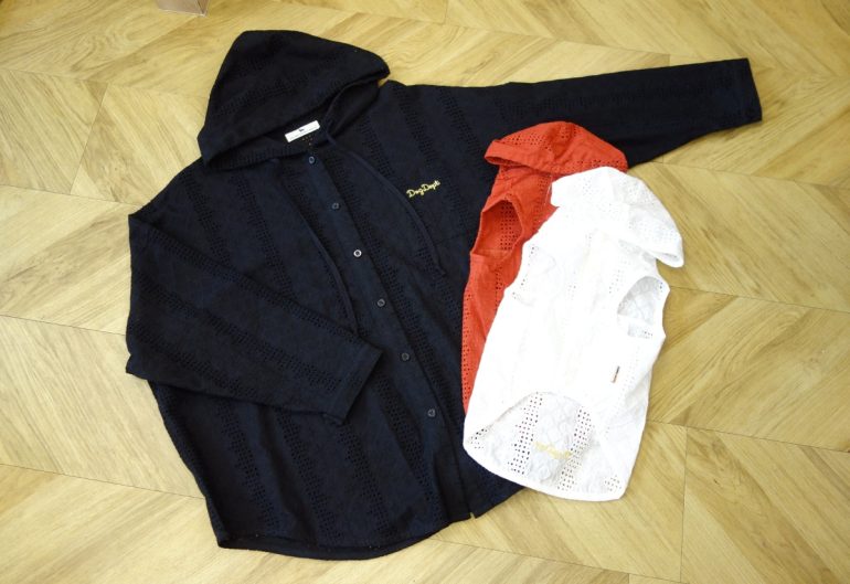 ドッグスタイリストのnanaeさんが注目したアパレルとして、ウーマンの「エンブロイダリーシャツパーカー」があります。繊細な刺繍レースで見せるフード付きの羽織りもので、生地の質感の高さも大きな魅力。カラーは写真のブラックのほか、オフホワイト、レンガも用意。サイズは1サイズのフリーとなっています。その「エンブロイダリーシャツパーカー」とリンクコーデできるドッグウエアが「エンブロイダリーノースリーブシャツパーカー」。こちらも繊細な刺繍レース生地を用いた愛犬用のフード付きノースリーブシャツパーカーで、愛犬同伴可能な高級ホテル、レストランにも似合う、とてもお洒落なデザインとなっています。カラーはオフホワイトとレンガで、こちらにはブラックはありません。サイズはXSから4L、DS、DM、BLの11サイズが揃っています。
