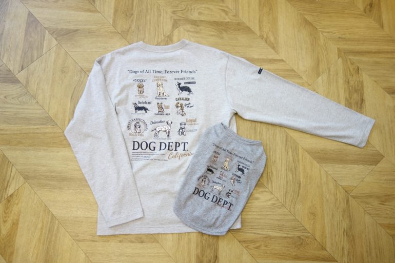 流行のレトロ感を前面に出したロンTがユニセックスの「dog of alltime,forever friends ロンT」。あらゆる犬種への愛をギュッと詰め込んだ背面プリントのロンTです。愛犬家にはたまらない、今期大注目の1枚となるでしょう。カラーは写真のミックスグレーとオフホワイト、カーキの3色展開。サイズはM、L、XL。もちろん、ドッグウエアとして「dog of alltime,forever friends T」も展開。こちらはクール、防蚊、UVカット加工の機能付きウェアとなっています。カラーは写真のミックスグレー(サンプル)とイエローの2色。サイズはXSから4L、DS、DM、BLの11サイズ。