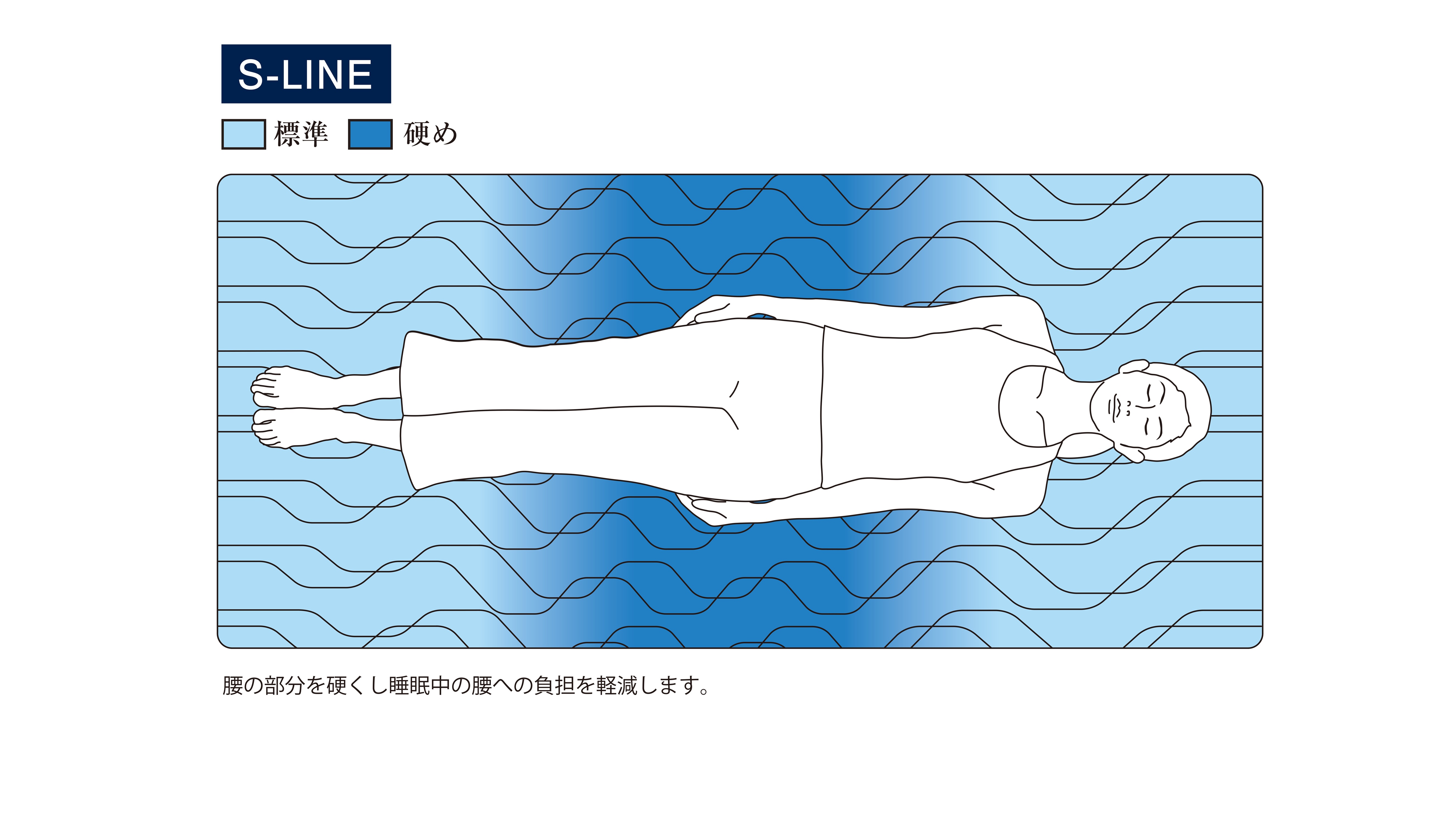 腰部分のサポートを強化した機能性モデル。腰部分を硬めに、肩と脚部分は標準の硬さに設計することで、立っている時と同じ理想的な背骨のS字カーブをキープする。