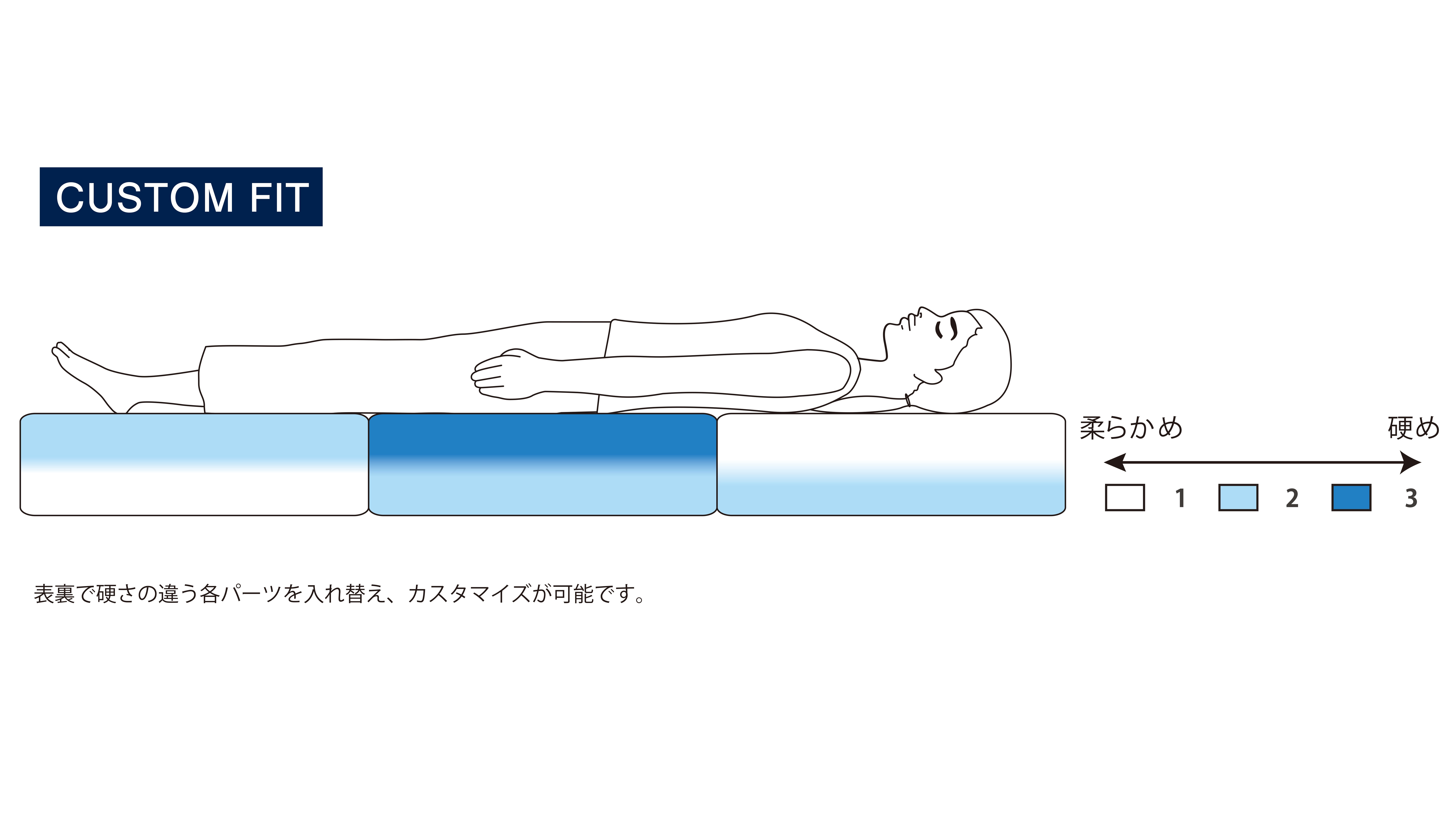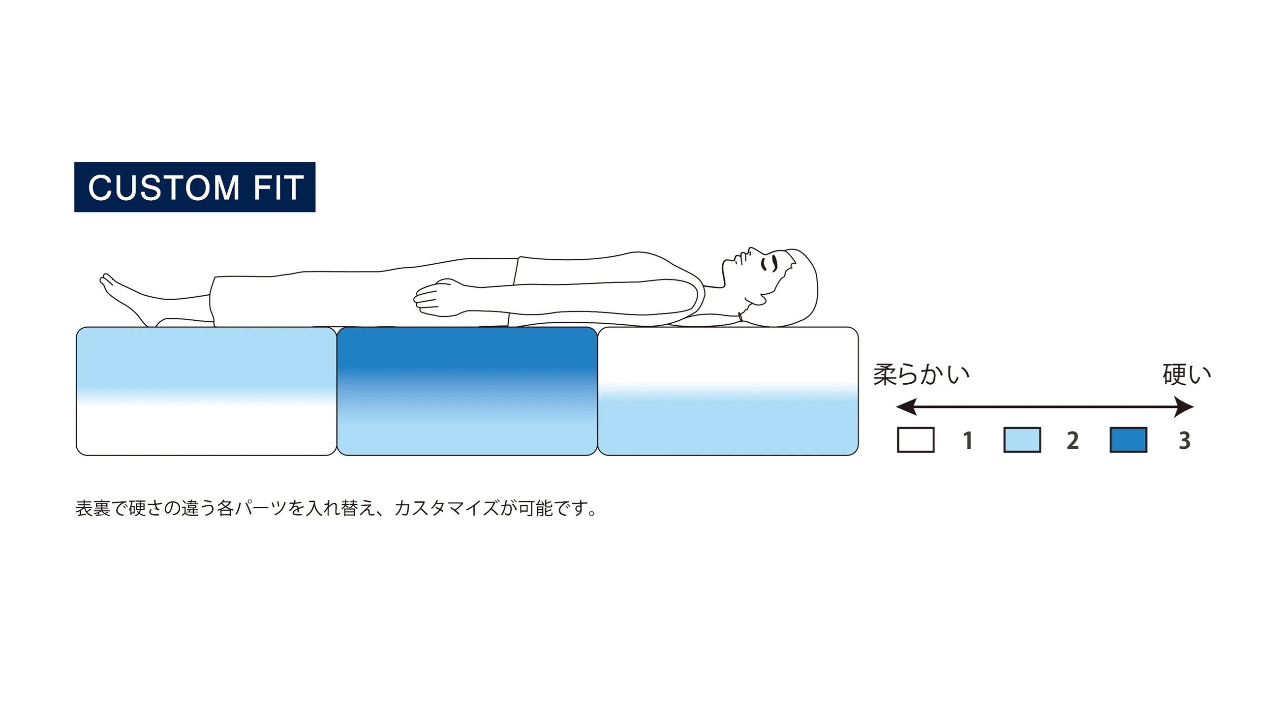 「3分割構造」を採用したベッドマットレスの新モデル。表裏で硬さが異なる3分割構造のブロックを入れ替えることで、一人ひとりの体形・体格に合わせてカスタマイズが可能。3段階の硬さを組み合わせることで、理想的な寝姿勢を実現する。