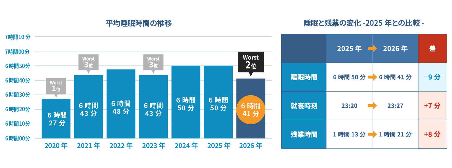 コロナ禍以降、日本人の平均睡眠時間は緩やかな増加傾向にあったが、2026年の有職者1万人を対象とした調査では、平均睡眠時間は6時間41分となり、調査開始以降で2020年に次ぐ過去ワースト2位という結果となった。